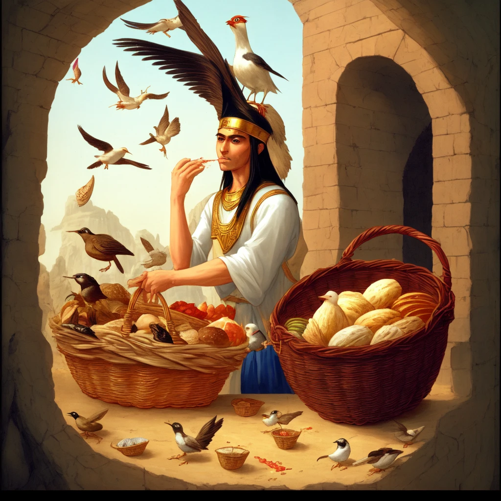 And in the uppermost basket there was of all manner of bakemeats for Pharaoh; and the birds did eat them out of the basket upon my head.